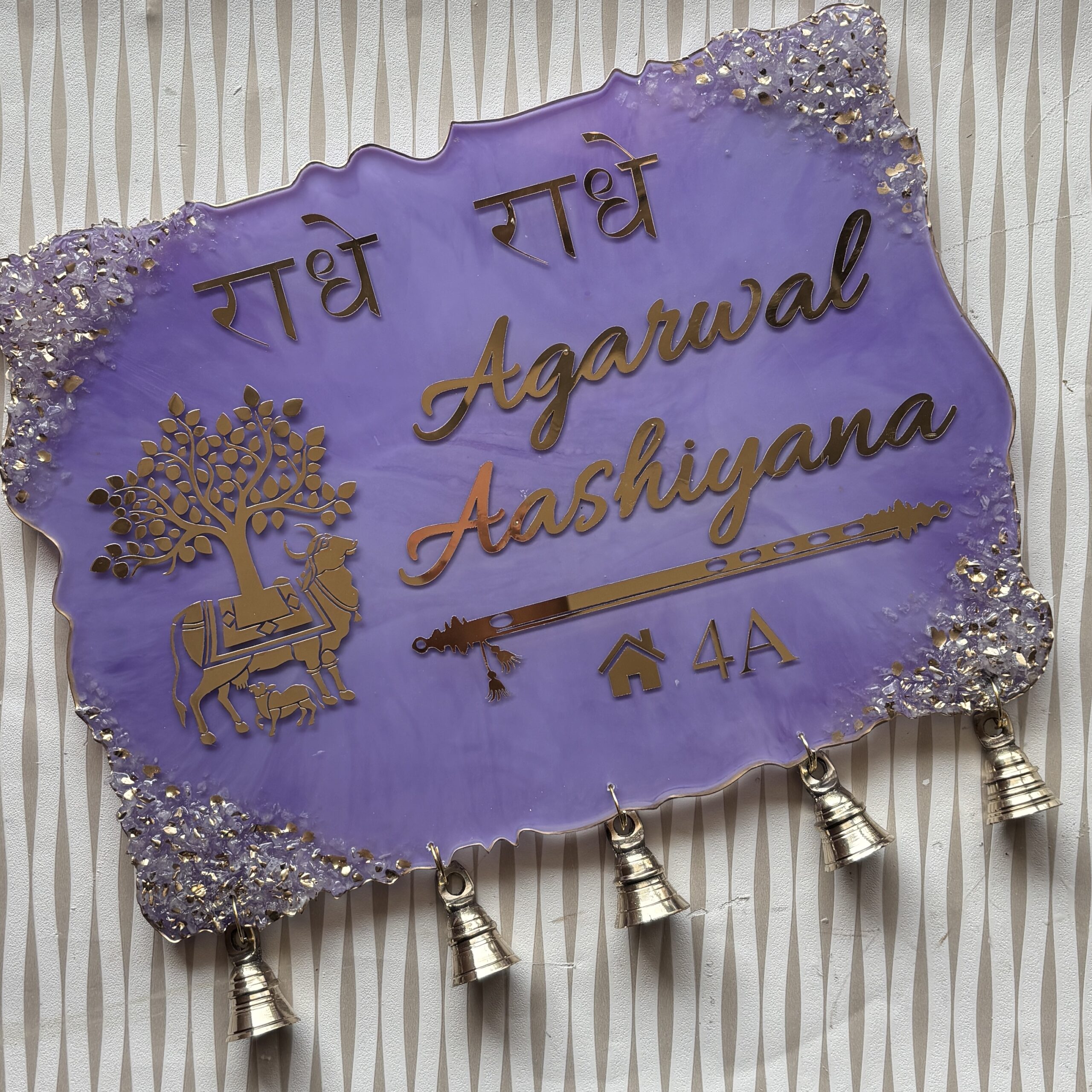 Handcrafted resin name plate featuring 3D brass bells resin along with crystals giving a joyful and warm look to your entrance. These come with hooks attached at the back for hanging. Base color- purple shaded