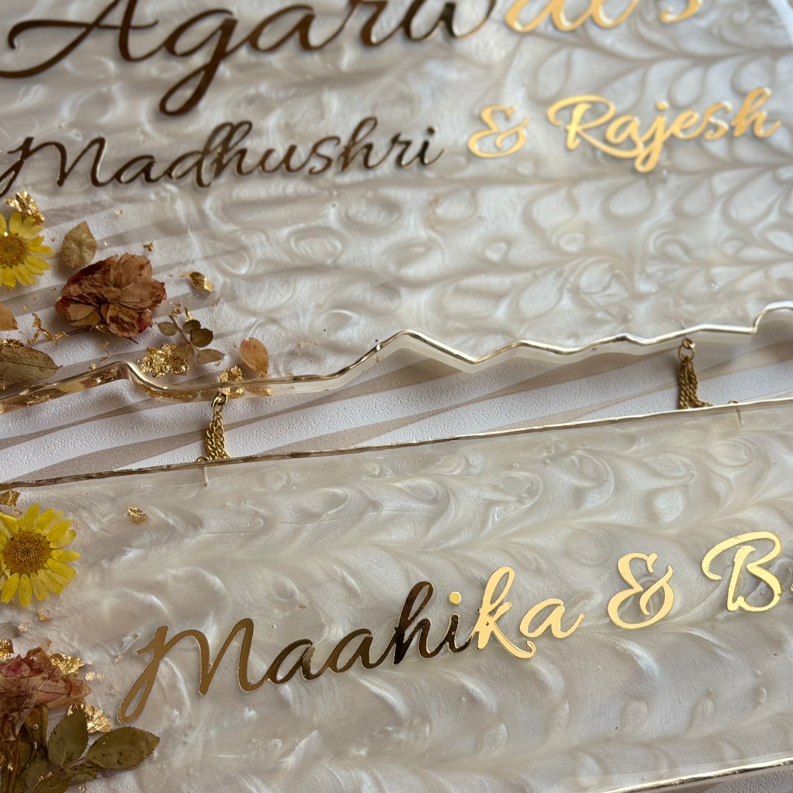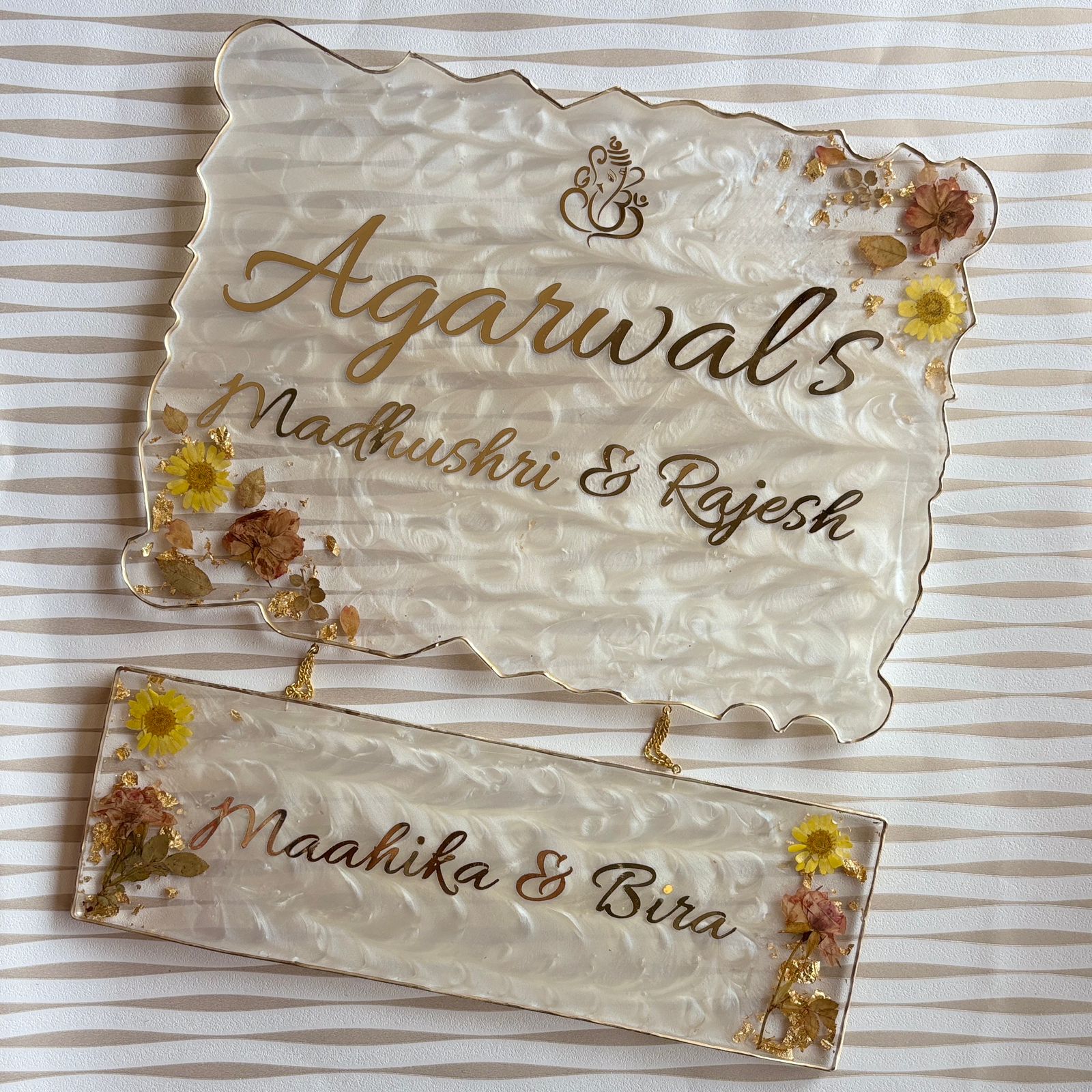 Elevate your space with our custom resin name plates, each one a unique blend of art and nature. Encased in crystal-clear resin and adorned with real dried flowers, these handcrafted pieces bring a personal touch and a natural elegance to your home, office, or event. These come with hooks at the back for hanging. Top plate size is 9×12 inches. Bottom plate size – 7×11 Inches